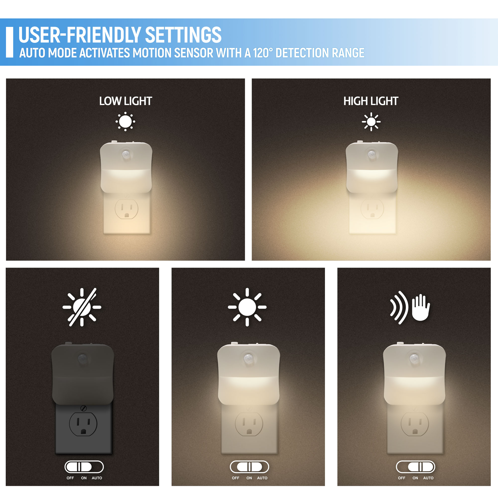 Power Source: Plugin Wall Outlet (110/240V AC) Dimensions: 2.4 x 2.4 x 1.5 inches Weight: 1.2 oz. per unit Light Temp: Warm white light (3000 Kelvin) Brightness: 7 Lumen Sensor Type: Ambient light sensor